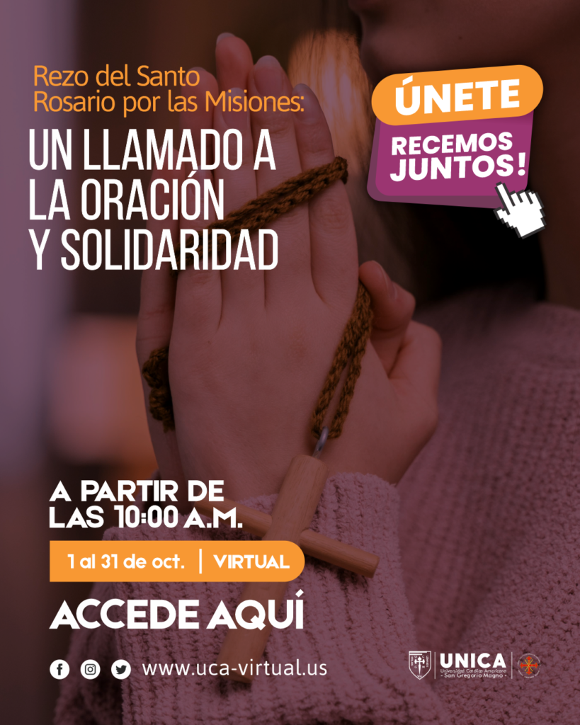 La capellanía virtual de UNICA se complace en invitar a toda la comunidad universitaria y a quienes deseen unirse desde cualquier parte del mundo al “Rezo del Santo Rosario por las Misiones”. Esta actividad, fundamental para cada cristiano dentro de la tradición católica, tiene como objetivo apoyar y fortalecer el trabajo misionero de la Iglesia en todo el globo.