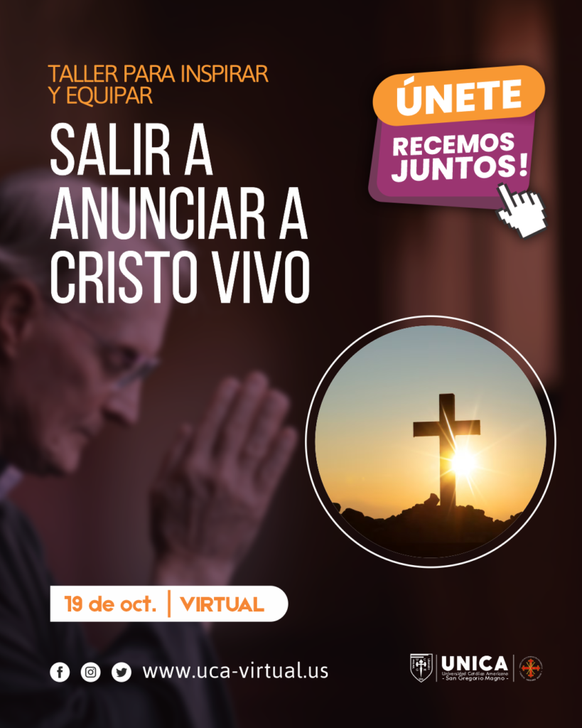 La Universidad Católica Americana – San Gregorio Magno (UNICA) te invita a participar en el apasionante taller virtual titulado “Salir a Anunciar a Cristo Vivo”. Este evento está cuidadosamente diseñado para inspirarte y proporcionarte las herramientas necesarias para compartir el mensaje de Jesucristo con confianza y autenticidad.
