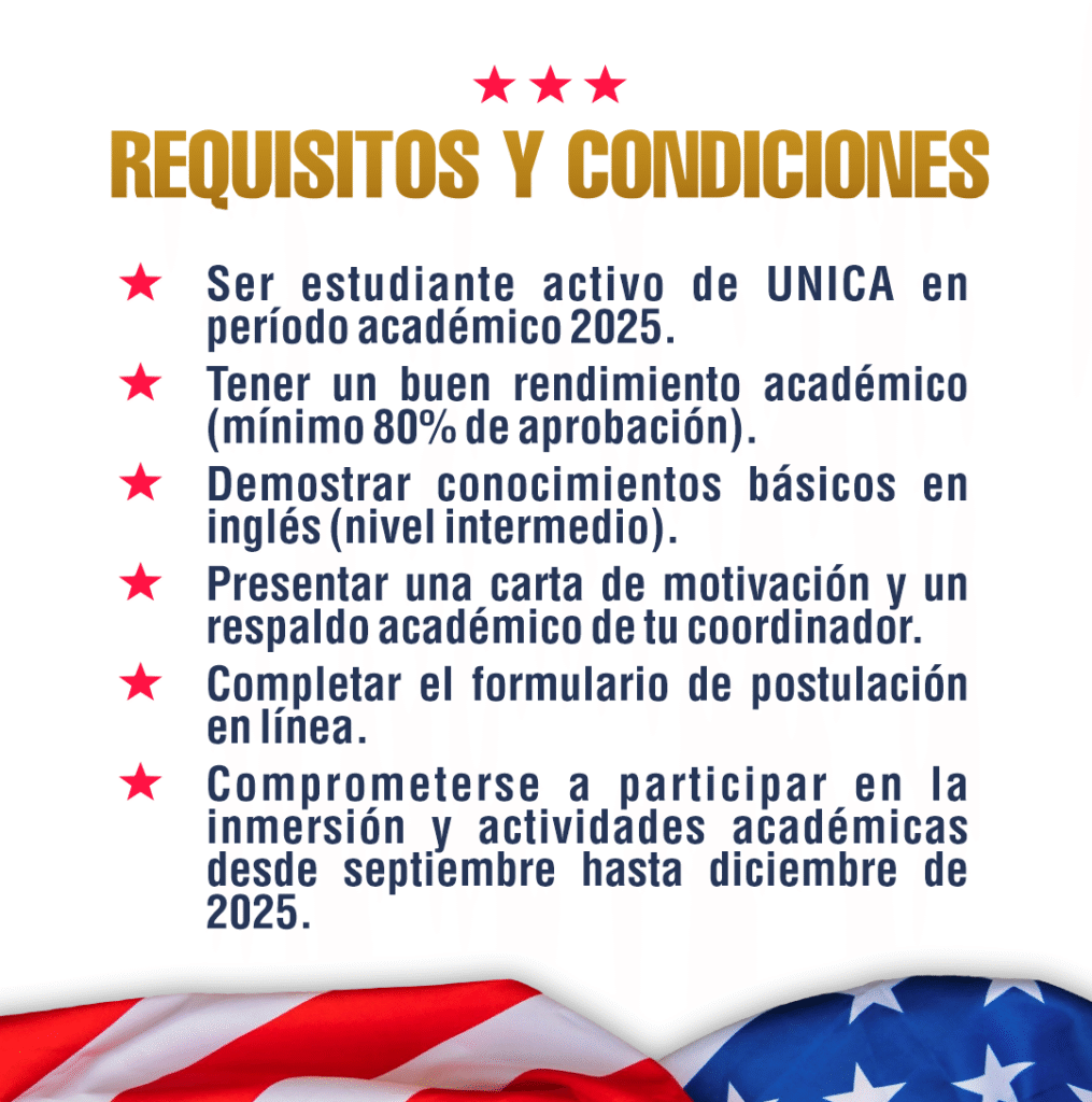 ¡Esta es tu oportunidad! La Universidad Católica Americana te invita a formar parte de nuestro programa de estancias académicas en Estados Unidos. Participa en investigaciones, prácticas internacionales y amplía tus horizontes académicos y culturales en instituciones aliadas en EE.UU.