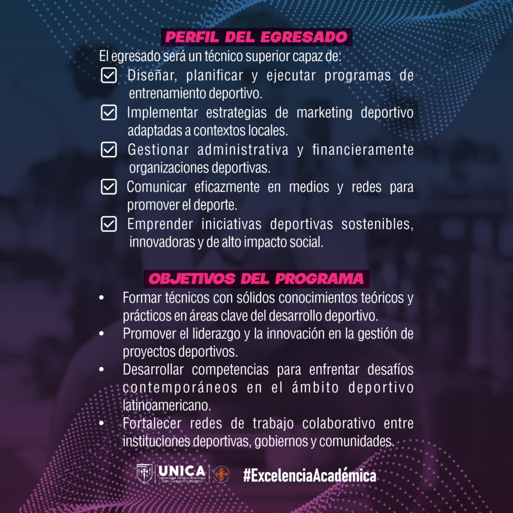 El Técnico Superior en Desarrollo Deportivo es un programa de formación orientado a responder a las demandas crecientes del sector deportivo en América Latina, integrando conocimientos, habilidades y competencias en entrenamiento, marketing, administración, comunicación y gestión empresarial. Busca formar profesionales capaces de promover el deporte como herramienta de desarrollo social, económico y cultural, contribuyendo al bienestar de las comunidades y al fortalecimiento de las organizaciones deportivas.