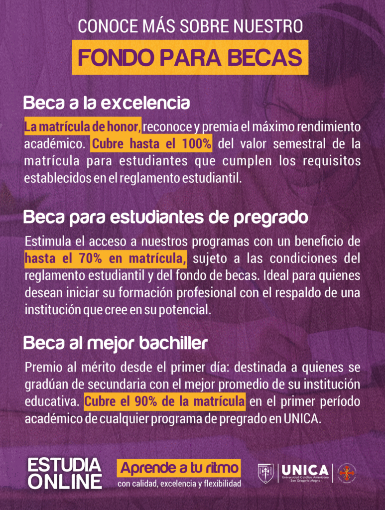 En la Universidad Católica Americana San Gregorio Magno, UNICA, creemos que una educación con propósito es la llave para transformar realidades. Por eso, además de programas académicos de excelencia, ofrecemos servicios, estímulos y becas que acompañan a nuestros estudiantes desde su ingreso hasta su graduación.